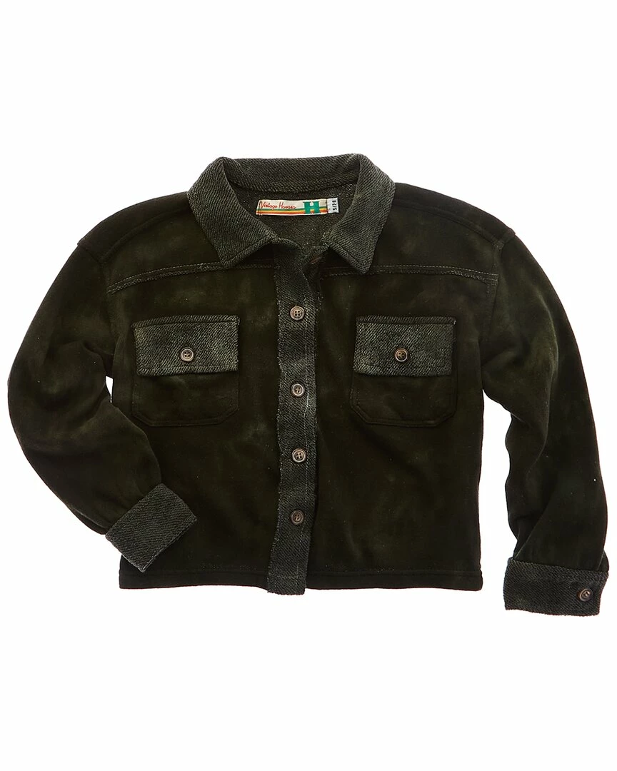 - Oversized Shacket In Winter Moss With Spread Collar, Dual Chest Pockets, Raw Edge Seams, And Button Cuffs