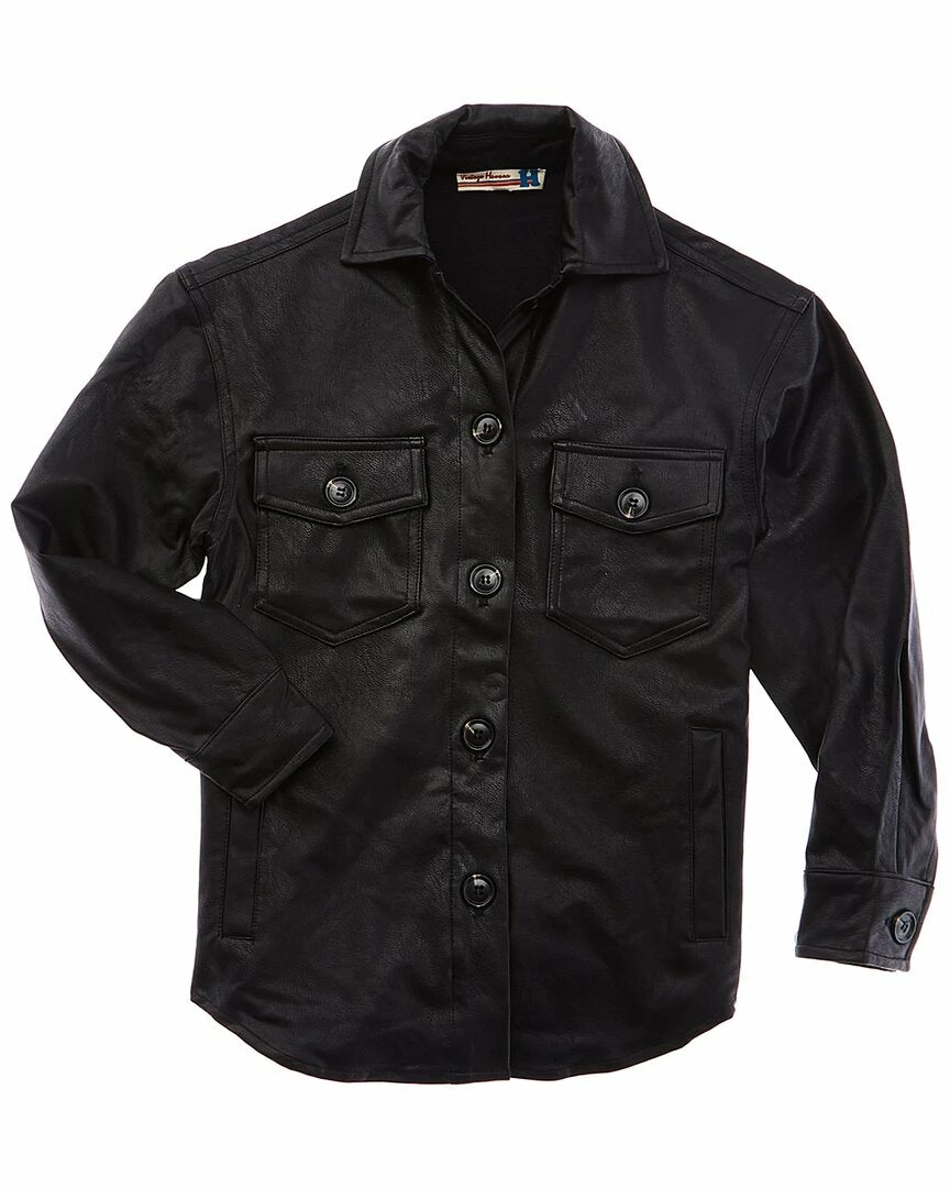 - Oversized Shacket In Black With Faux Leather Design, Spread Collar, Dual Chest Pockets, Dual Front Pockets, And Button Cuffs