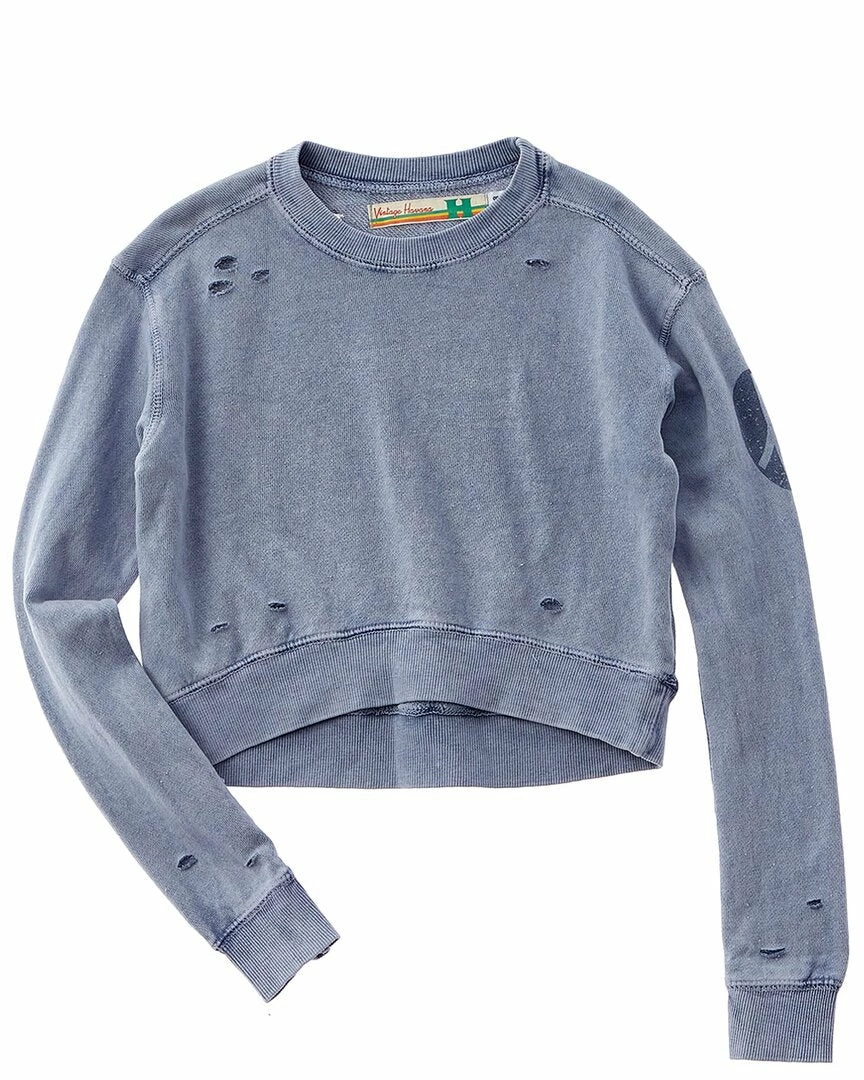 - Peace Sign Sweater In Blue With Distressed Detailing And Ribbed Trim