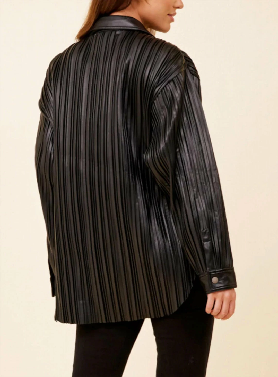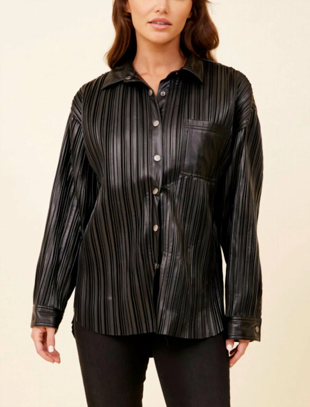 The black pleated leather shacket has gunmetal snaps up the front.ΓΒ This vegan leather shacket has a collar, a pocket at the chest and cuffs that are all not pleated.ΓΒ Cuffs have snaps as well.ΓΒ This edgy jacket should be layered over a tee, tank, bralette or sweater and worn with attitude.ΓΒ 100% polyurethane.ΓΒ Spot clean.ΓΒ Do not machine wash.Kim is wearing the black pleated leather shacket in a large and paired it with the ribbed black tank in large, the super stretch skinny jean in large and the tonal belt in black.